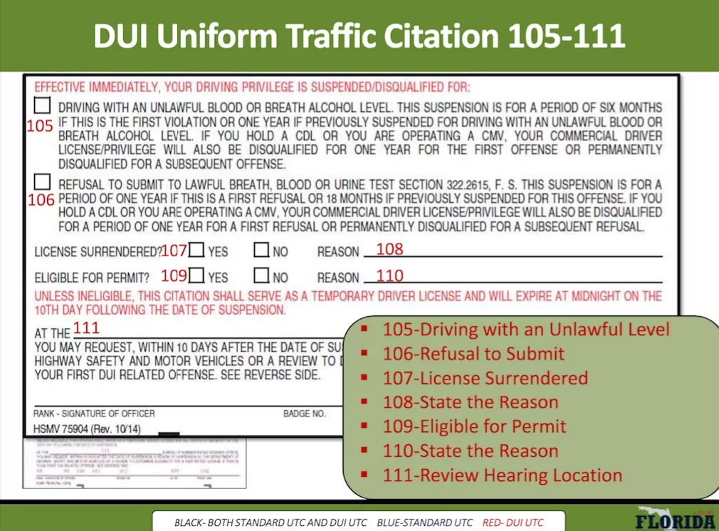 - Florida DUI Uniform Traffic Citation – The citation is used exclusively for DUI offenses with an alcohol level of .08 or above or for refusing to submit to breath, blood, or urine tests. The Florida DUI UTC also operates as the notice of the administrative suspension.