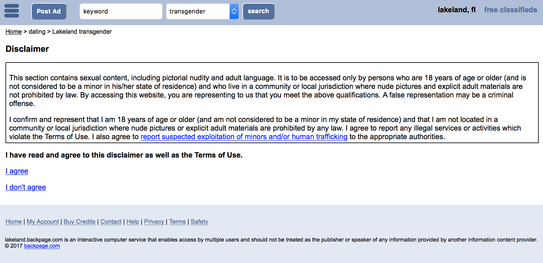 The disclaimer for the “dating sections” on the Backpage[dot]com website contained the following disclaimer: